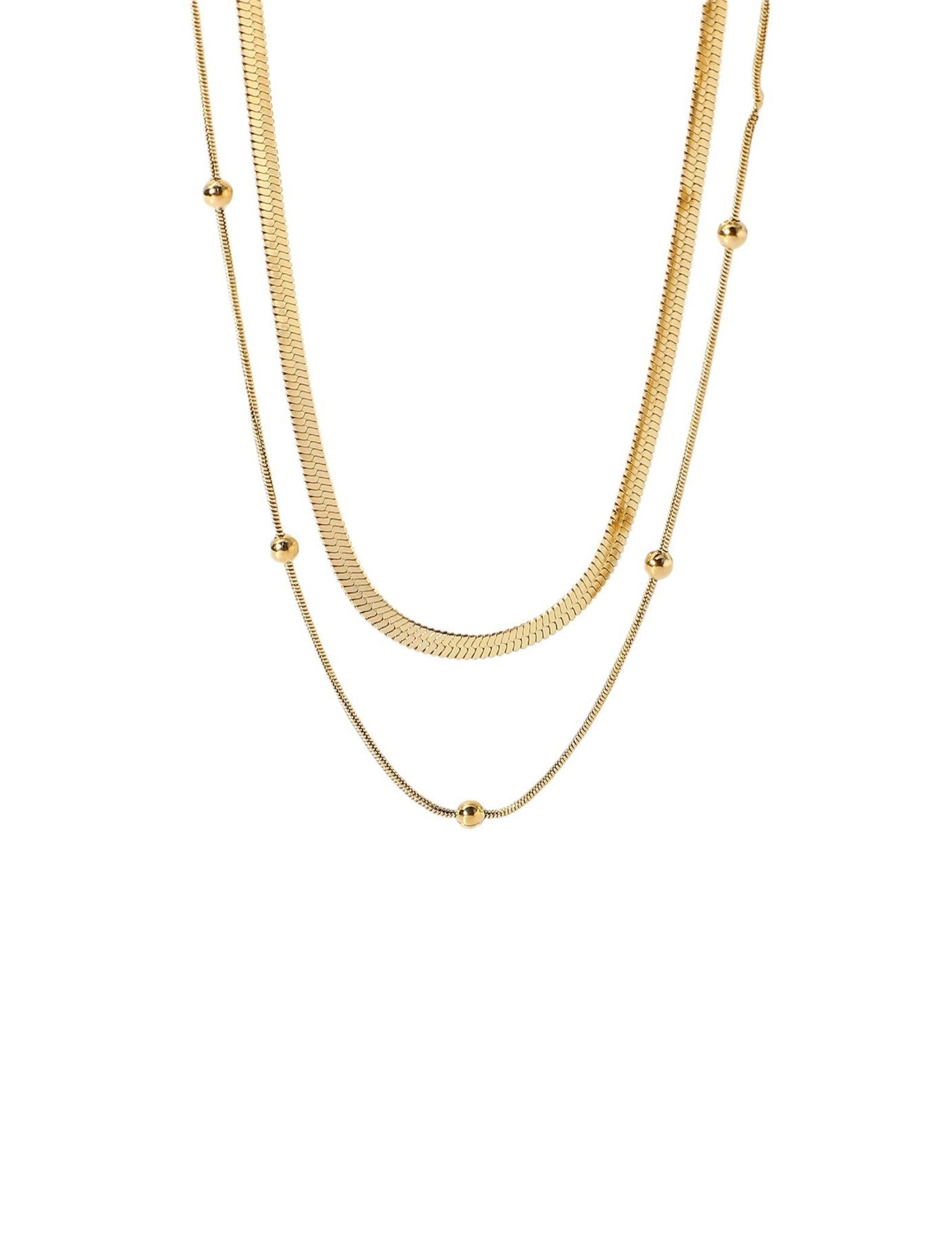 Transform your style with the stunning Analiese Necklace which features a double-layer snake chain and another chain adorned with a delicate bead, offering a sophisticated touch to any outfit.