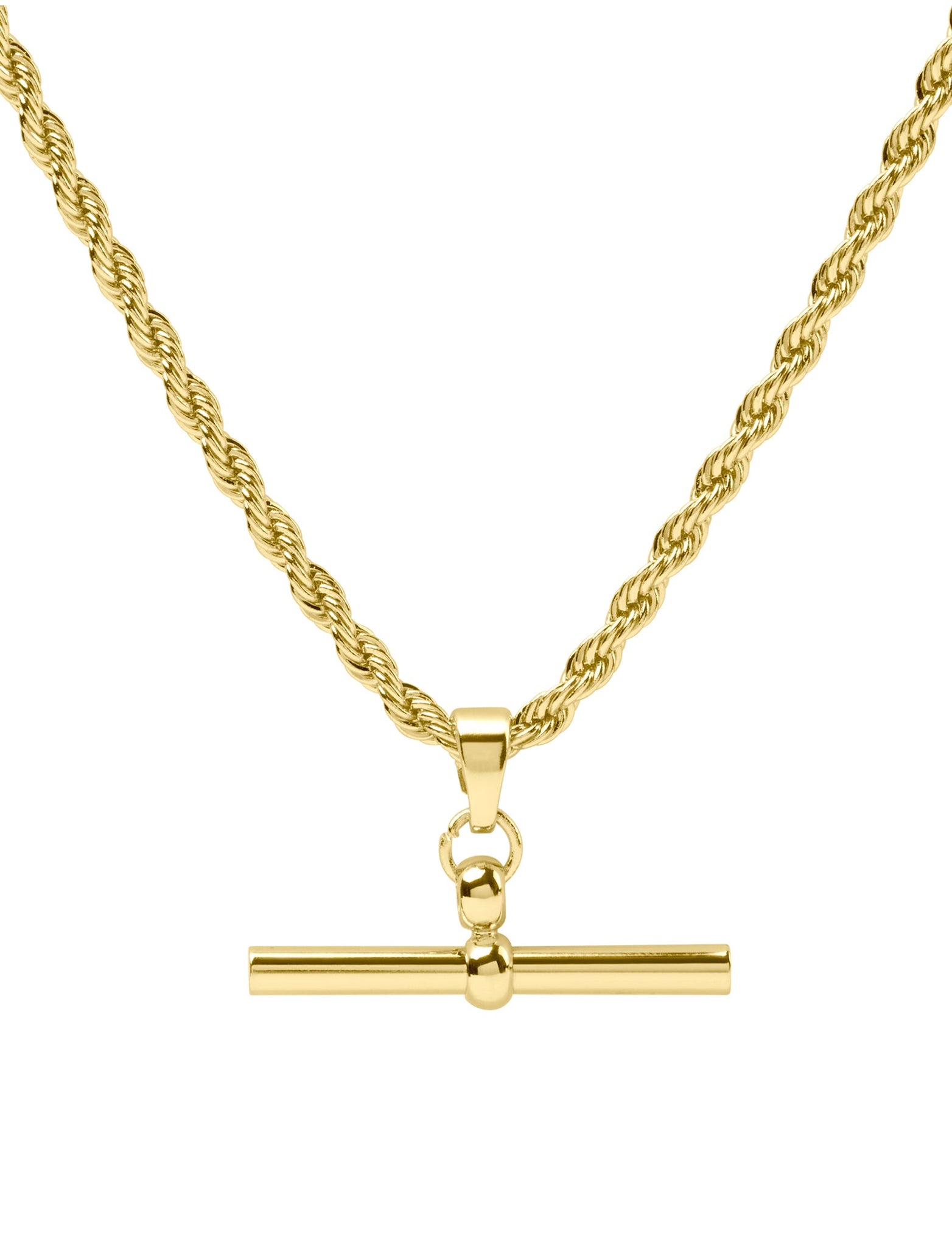 Our stylish Hali Necklace is a well-crafted piece designed for daily wear. It carries a rope style chain, complete with textured twisted links carved through IP yellow gold plated stainless steel. With a polished finish of yellow gold that gleams with warmth, the necklace measures 42cm in length, allowing the pendant to position perfectly around the middle of your chest. The necklace is further enhanced with a smooth T bar pendant, all held together by a sturdy lobster clasp.
