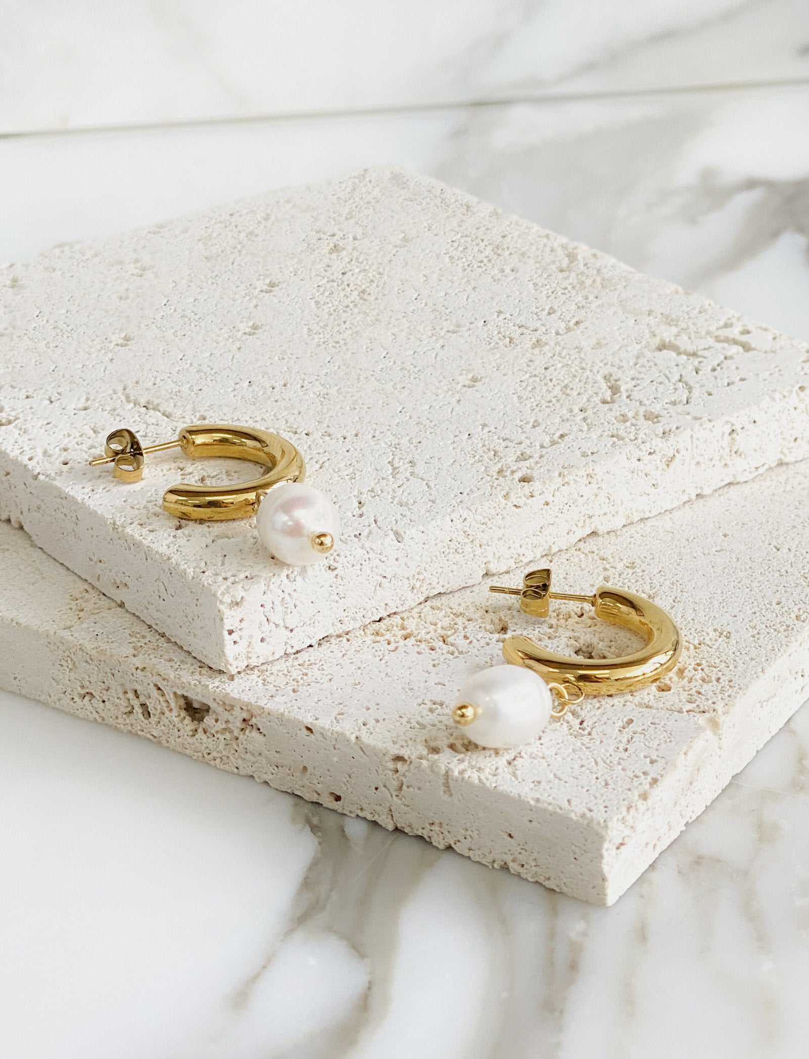 Exquisitely crafted from resilient stainless steel and opulent IP yellow gold plating, these earrings exude an unparalleled sheen that's bound to catch the eye at every occasion Each hoop is complemented with a lustre-rich freshwater pearl, adding a feminine and delicate touch to the overall design.