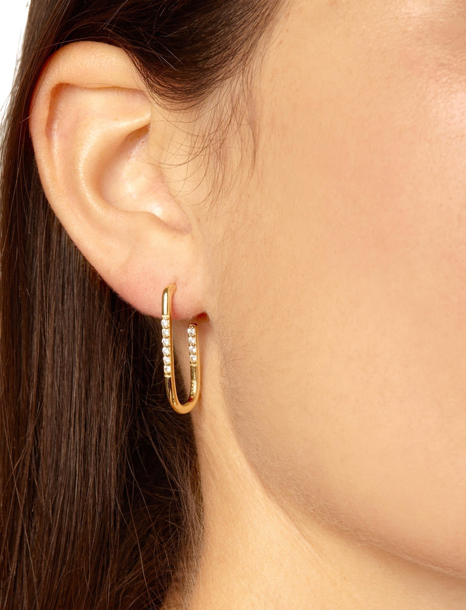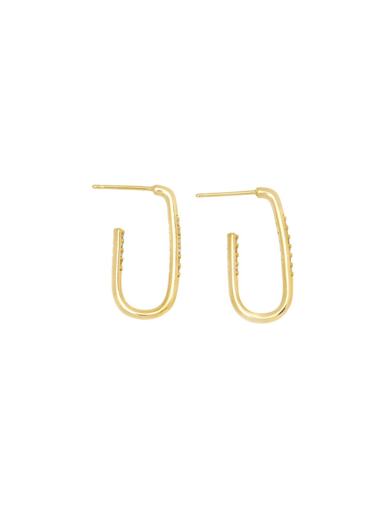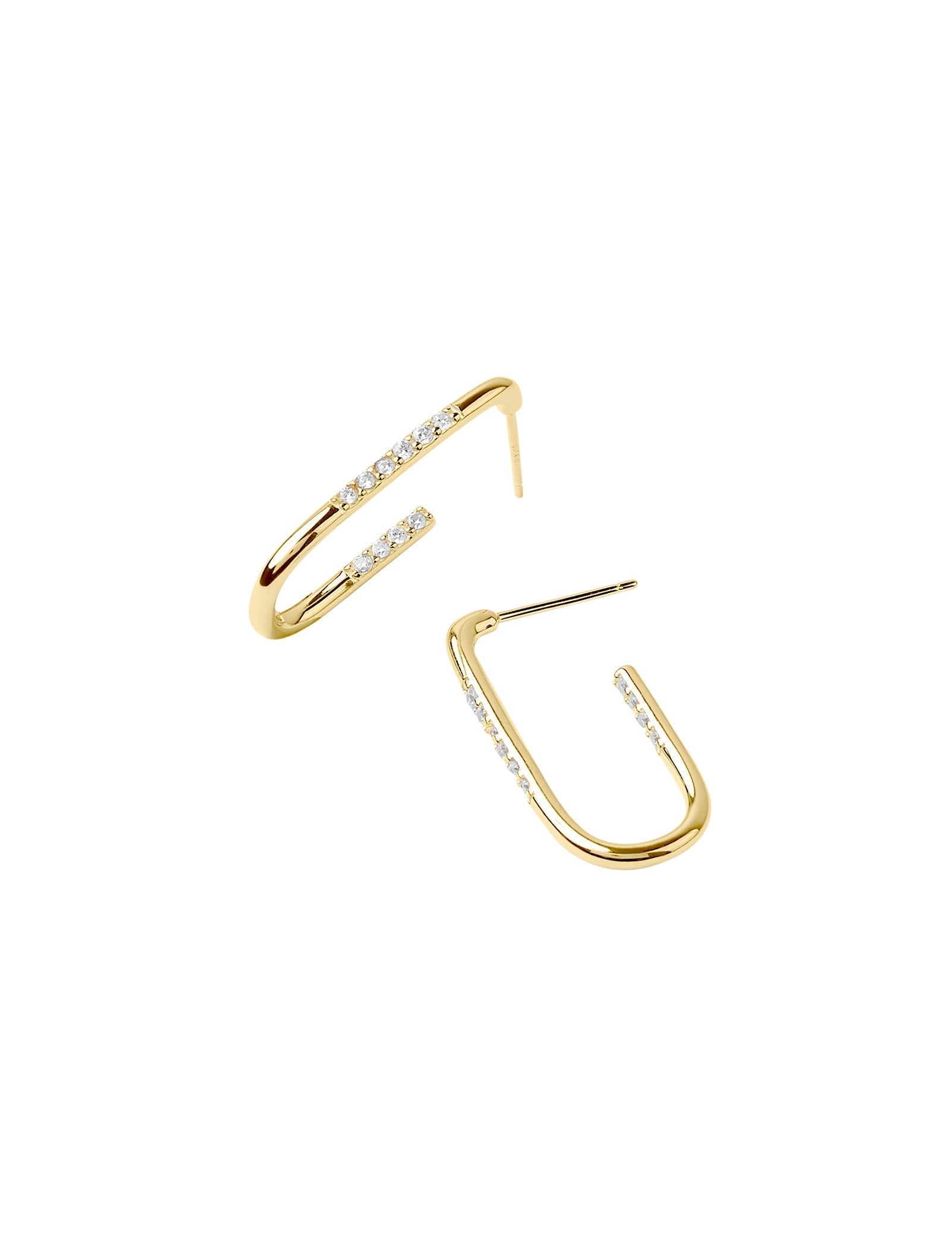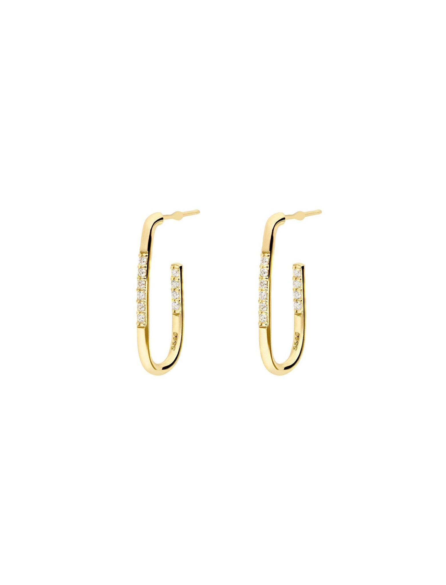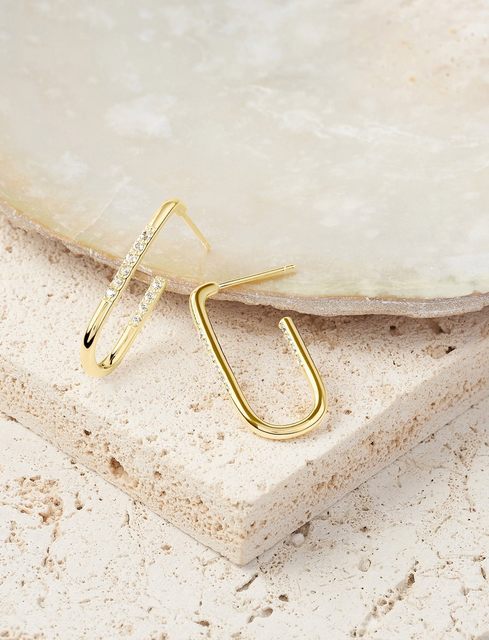 These eye-catching and unique earrings draw inspiration from the stars, showcasing a rectangular drop hoop design Crafted from sterling silver and donned with yellow gold plating, they offer an effervescent glimmer that exudes a luxuriously sophisticated feel.