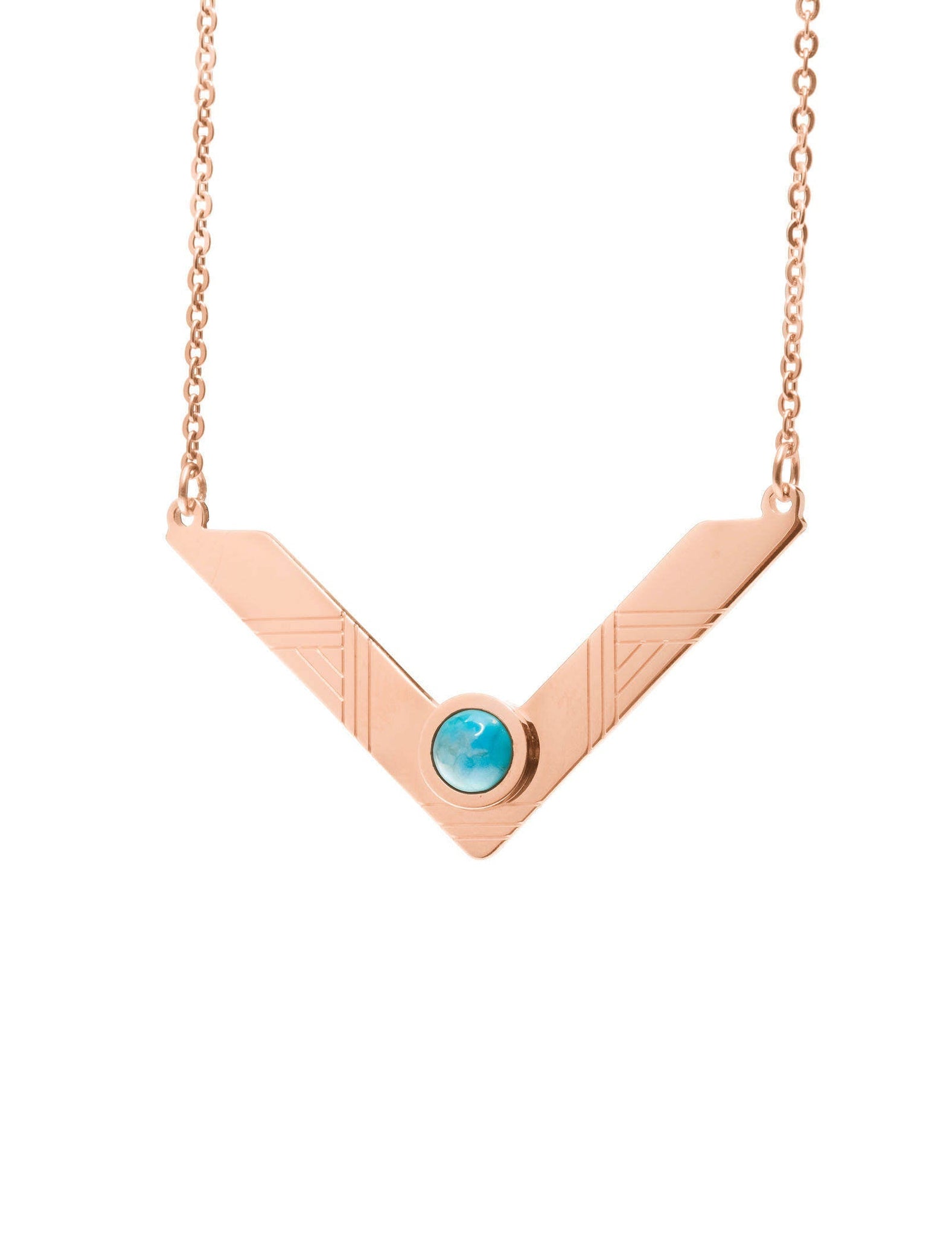 Formed with precision, the necklace features a provocative arrow pendant, laced with a natural Howlite centre stone, whose turquoise hue lends the piece its compelling allure Encased in a bed of high-quality rose gold plated stainless steel, the Blue Flame Necklace is constituted to last, its radiant finish stealing the show, while its 43cm long chain and 40mm x 9mm pendant ensure a versatile fit for all.