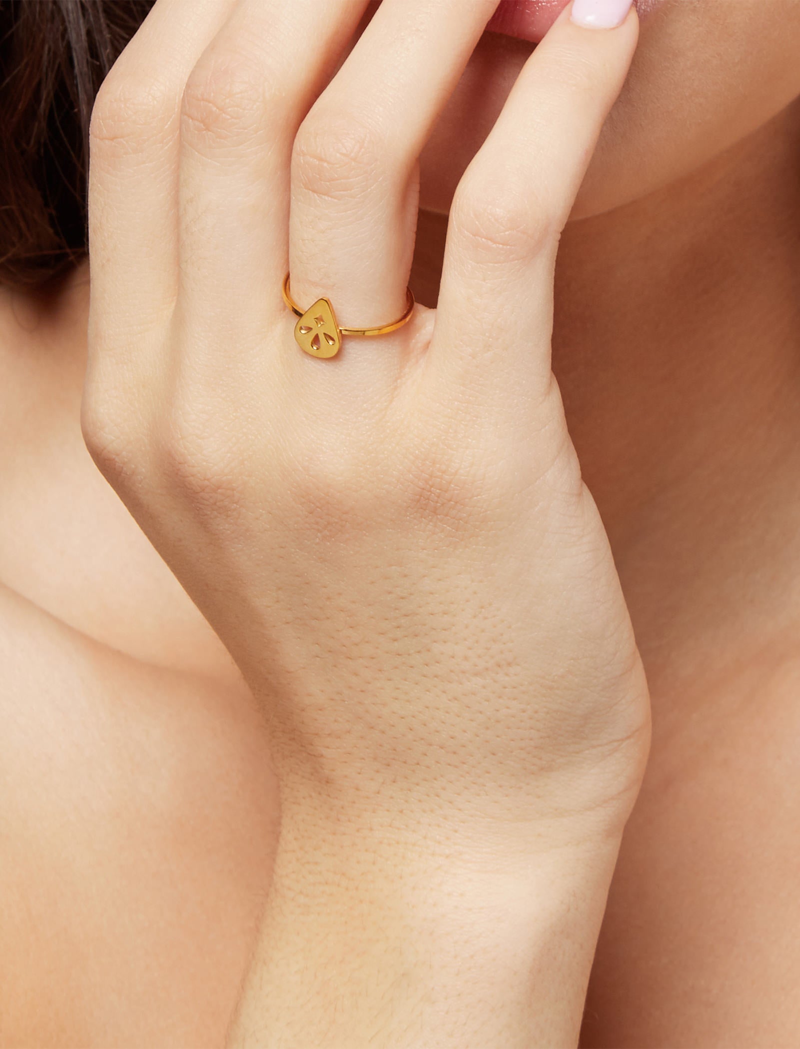 Suitably dainty, it sits with a seamless finesse between your fingers Made with enduring IP yellow gold plated stainless steel, the material is not only sturdy and durable but also hypoallergenic.