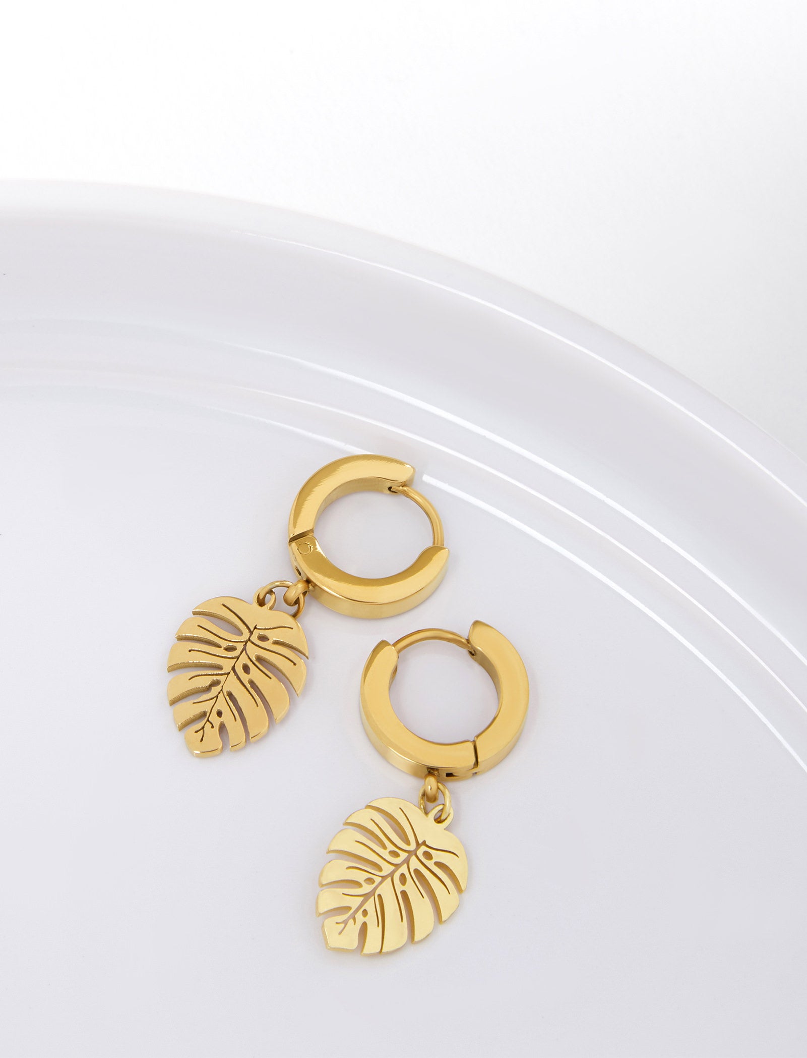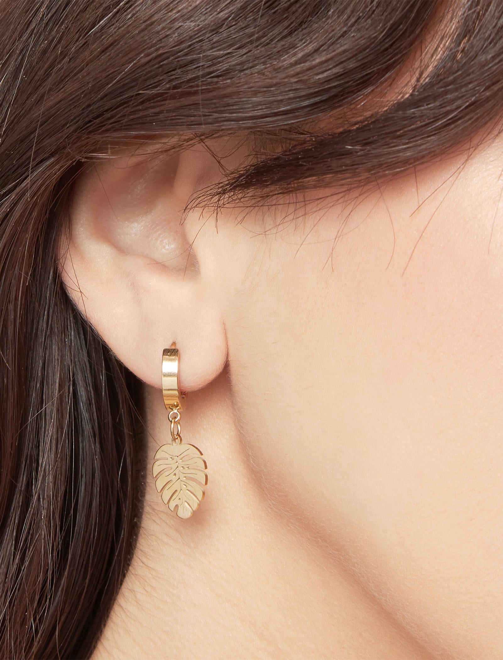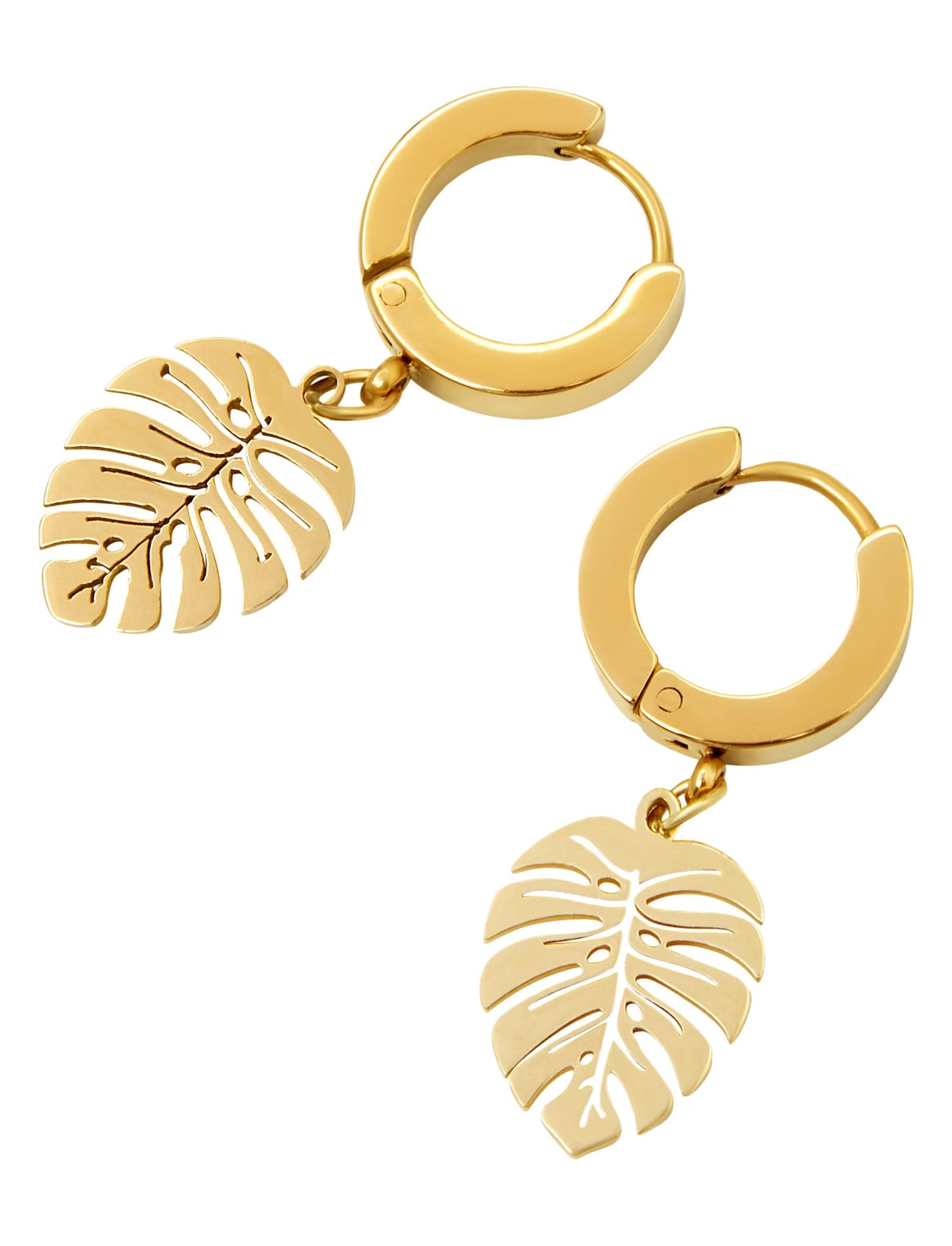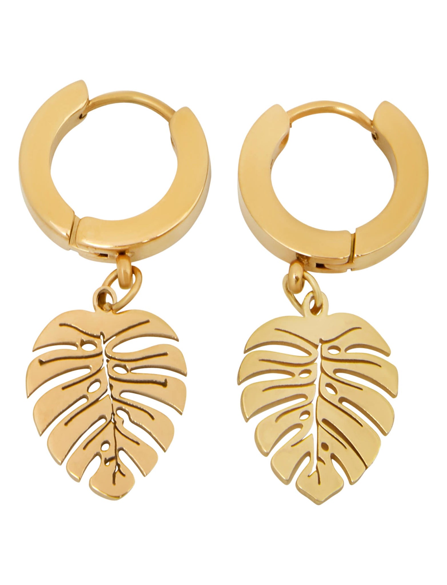 Each earring features a flawlessly crafted, intricate cut-out tropical leaf shape suspended from a shiny, huggie style hoop The sophisticated brushed gold finish, whether in Rose Gold or Yellow Gold, lends a modern and stylish touch to this captivating piece.
