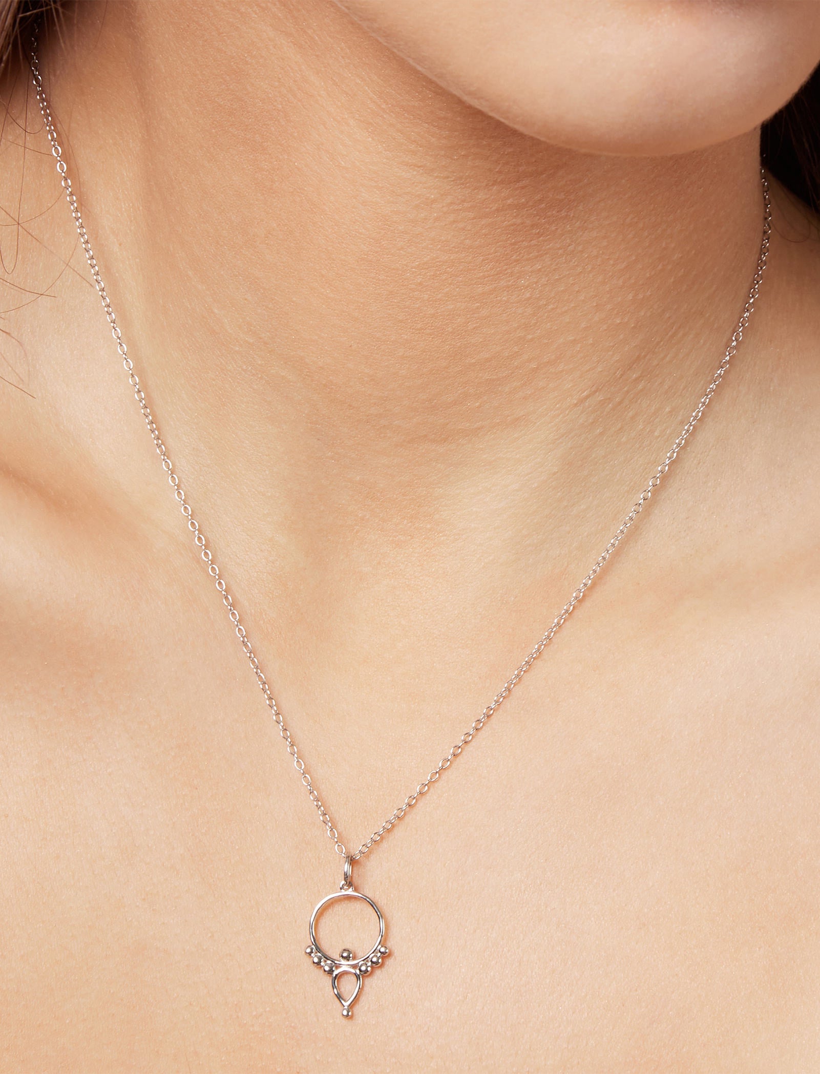Infusing simplistic charm with splendid elegance, this necklace showcases an open circular design, with an elegant drop-shaped addition and glistening ball details that mimic dazzling jewels.