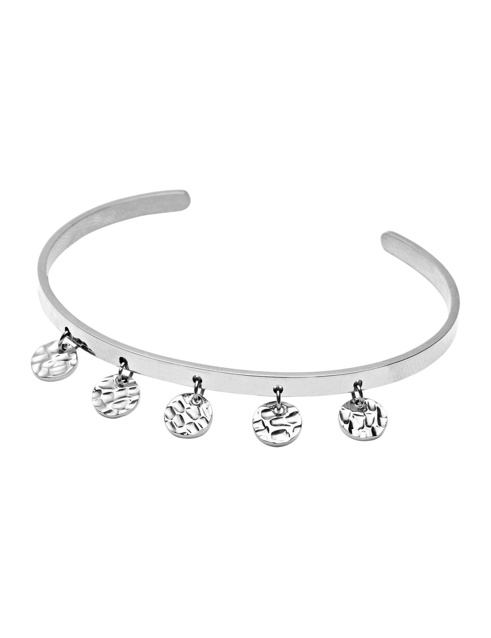 This open cuff boasts intricately beaten discs that dance with your movement and capture the light to reflect your effervescent style Specially crafted from robust stainless steel, the cuff exemplifies strength, durability, and lasting allure.